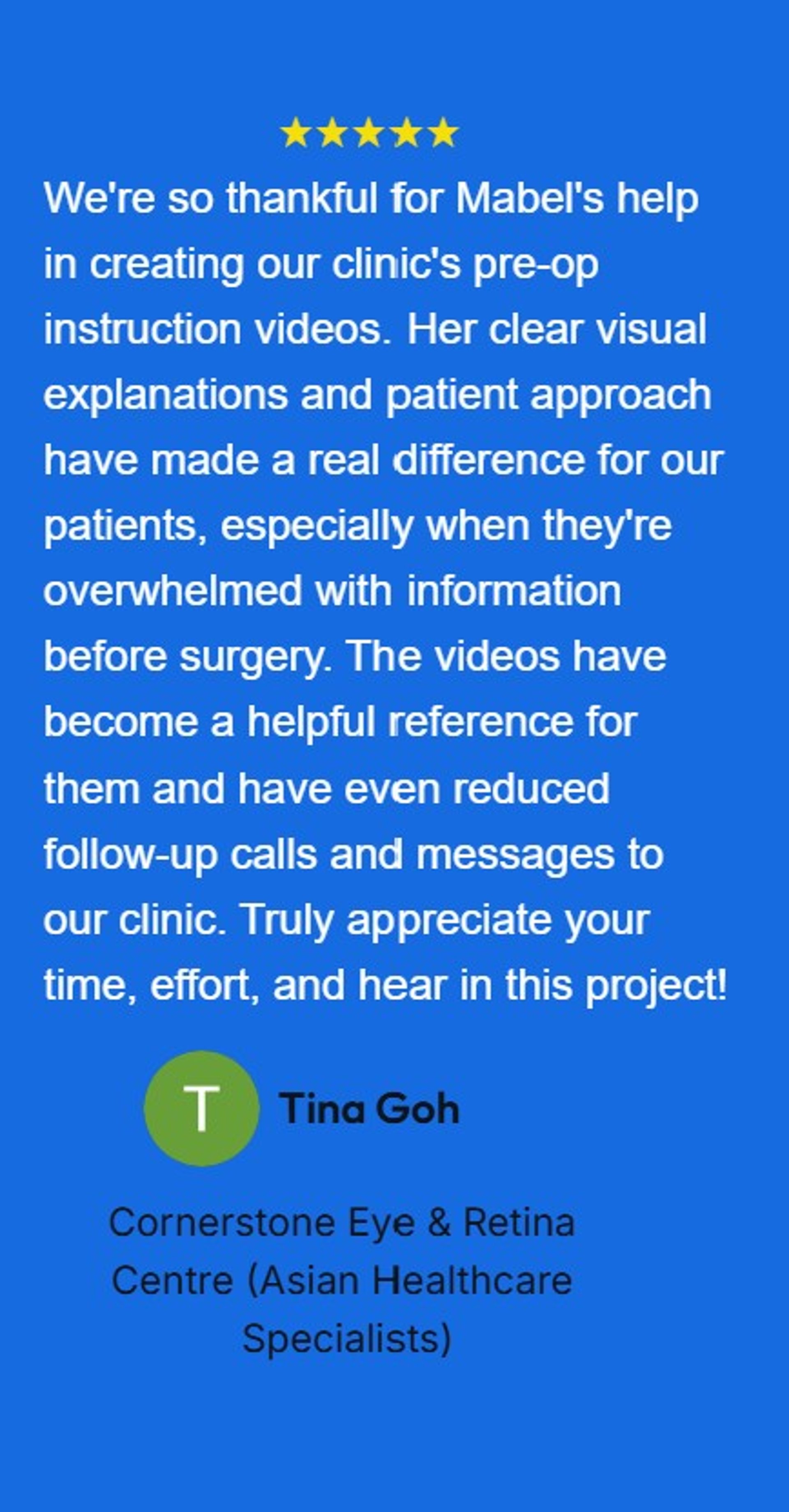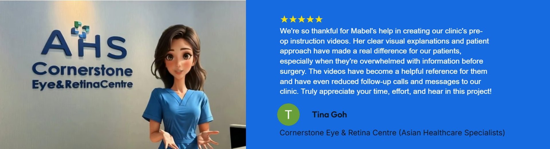 We're so thankful for Mabel's help in creating our clinic's pre-op instruction videos. Her clear visual explanations and patient approach have made a real difference for our patients, especially when they're overwhelmed with information before surgery. The videos have become a helpful reference for them and have even reduced follow-up calls and messages to our clinic. Truly appreciate your time, effort, and hear in this project!